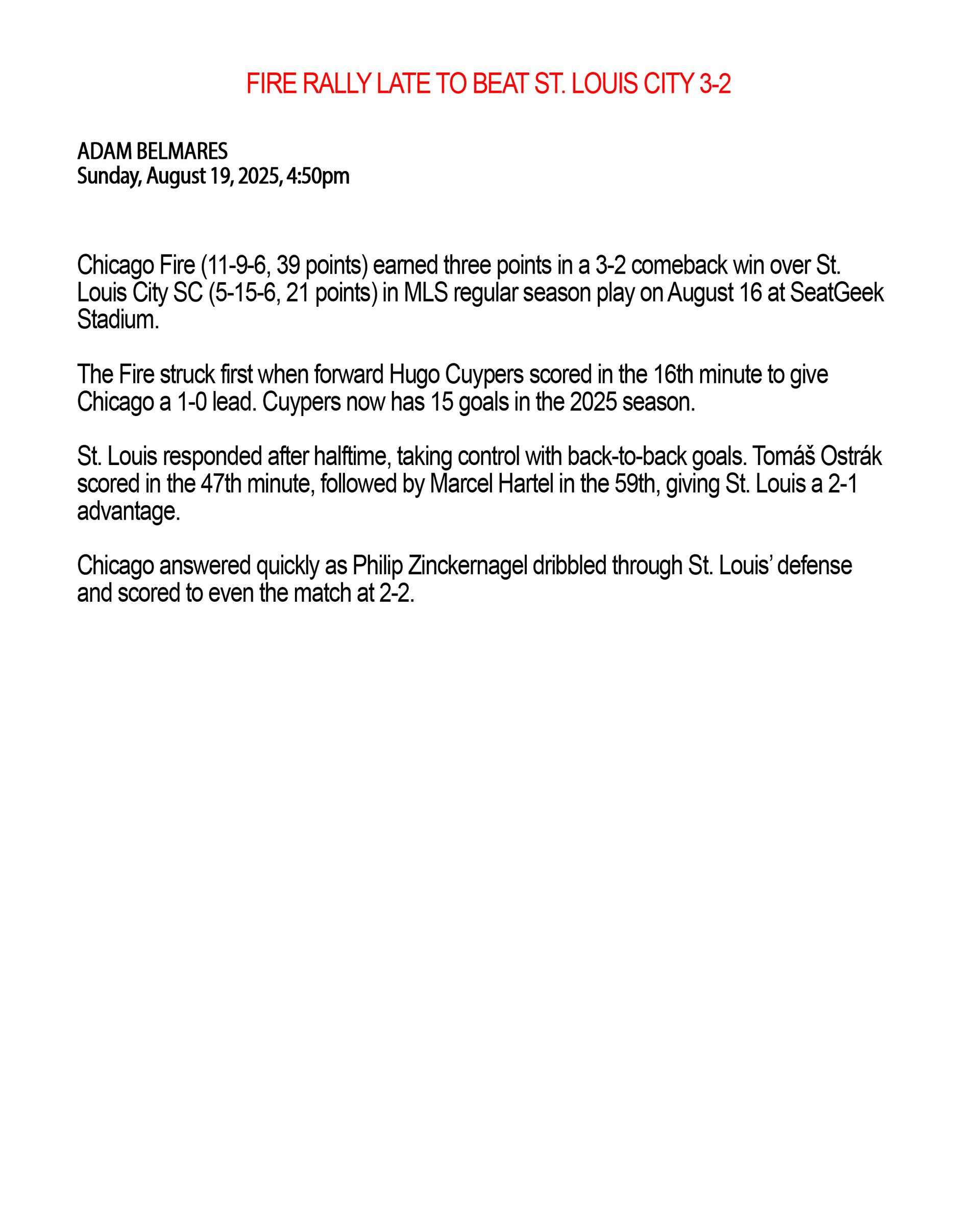 CHICAGO FIRE FC v ST. LOUIS CITY MLS 8.16
